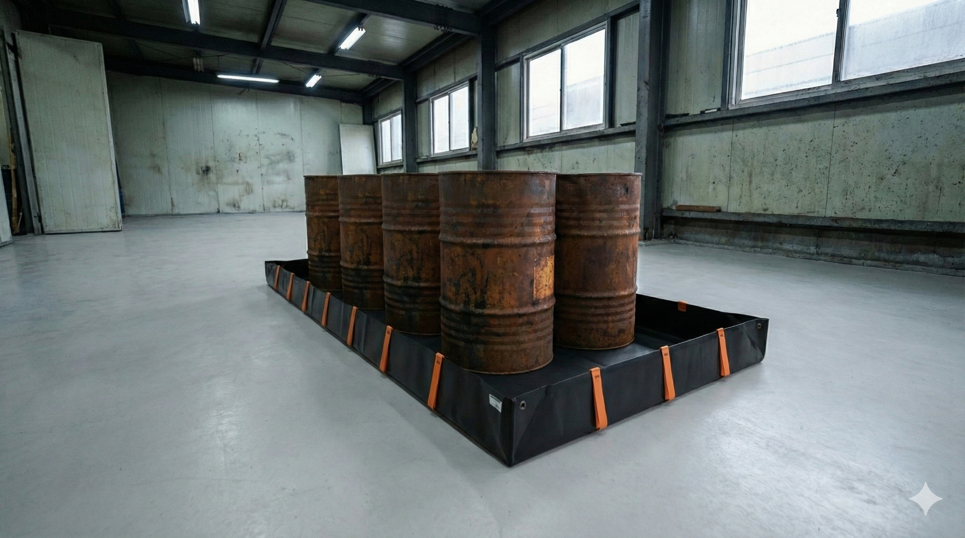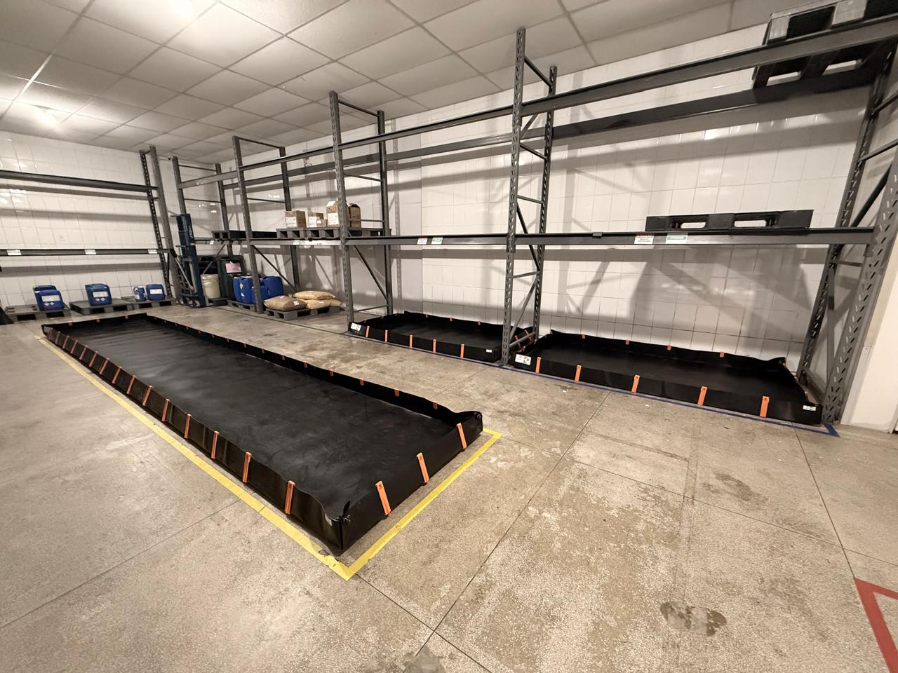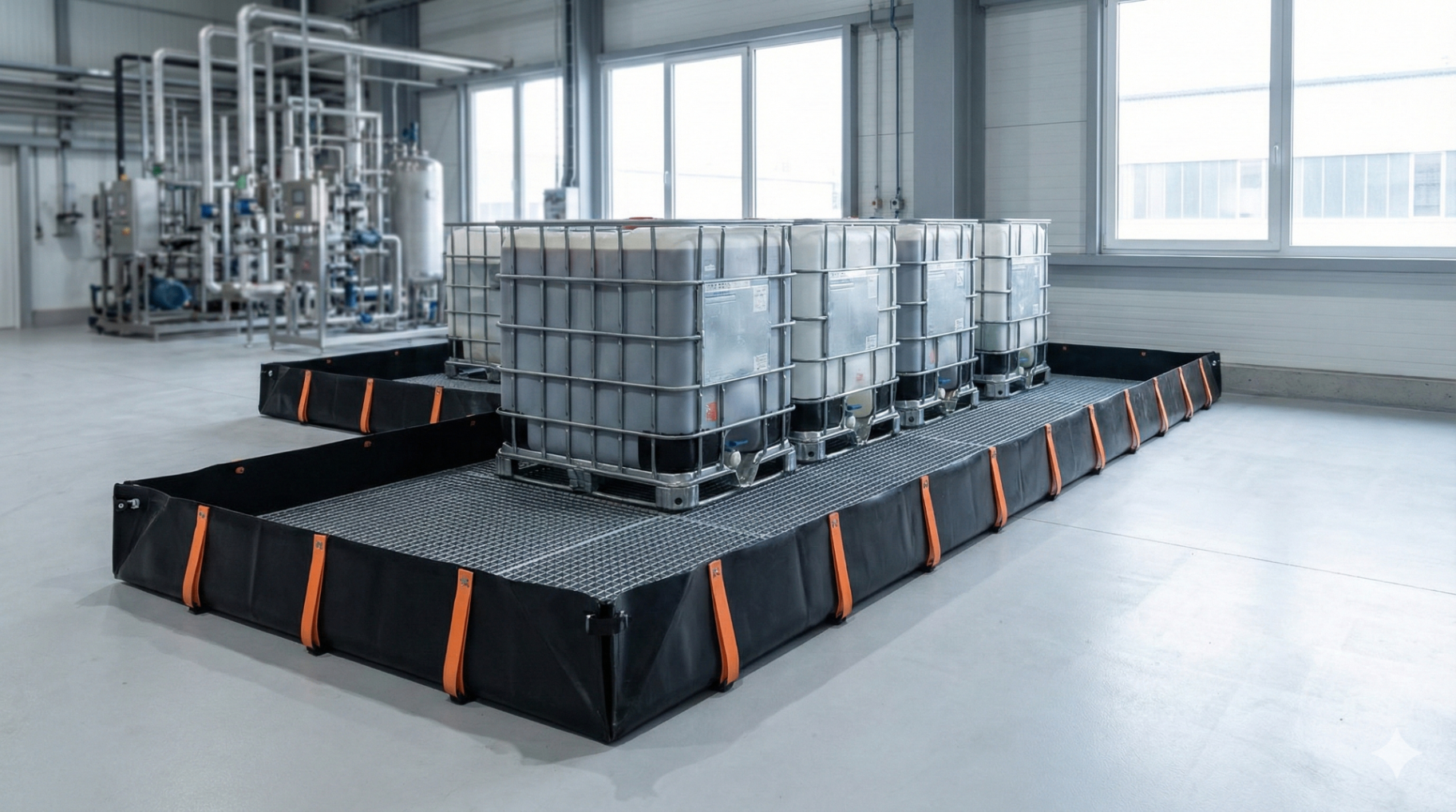 Bacias projetadas especificamente para containers IBC, com capacidade de retenção total em caso de vazamento.